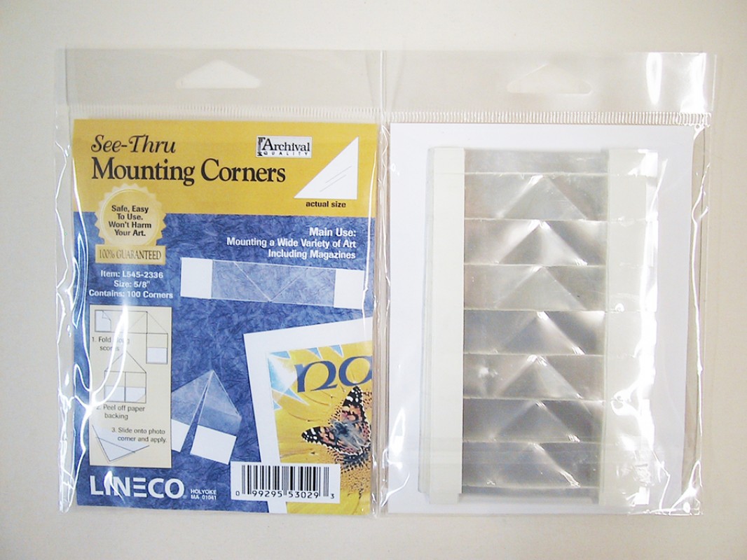 Les coins transparents de montage permettent de monter sécuritairement des photos, des cartes postales, des lettres, des imprimés ou tout item de papier. Les coins sont prépliés pour une application rapide et sont fait de polyester de qualité d'archives. L'adhésif double-face utilisé est le ruban 415 de 3M qui est un des rubans approuvés par les institutions d'archives. Ces coins offrent une solution facile et pratique pour du montage d'archives. Idéal pour le montage d'item plus volumineux comme des magazines.